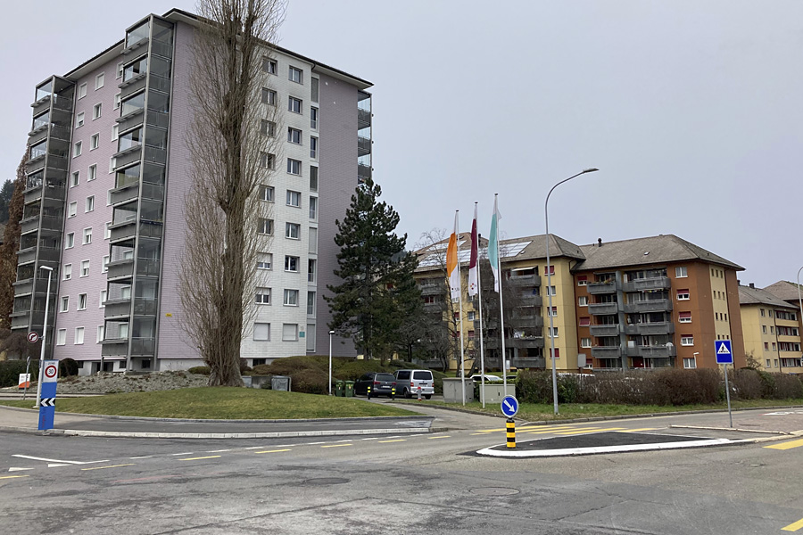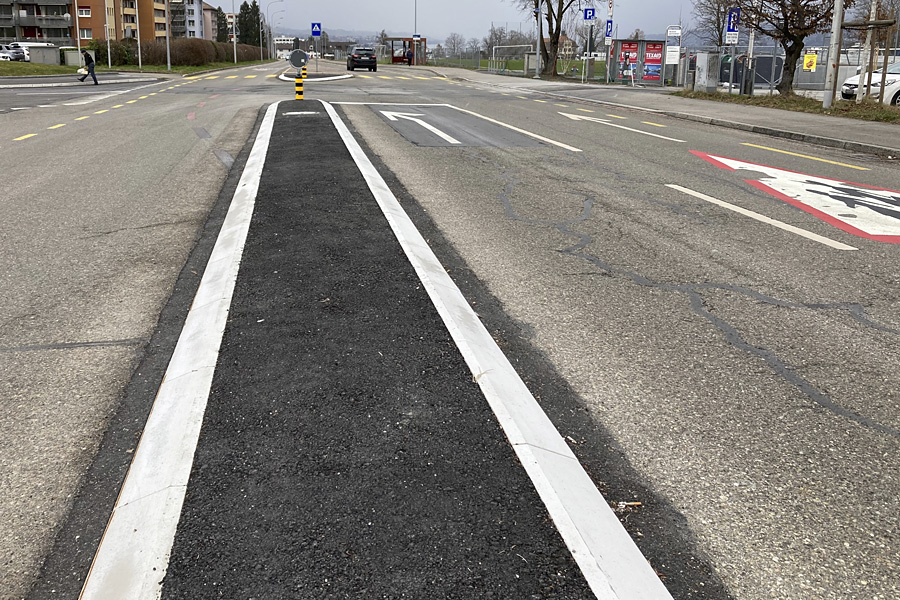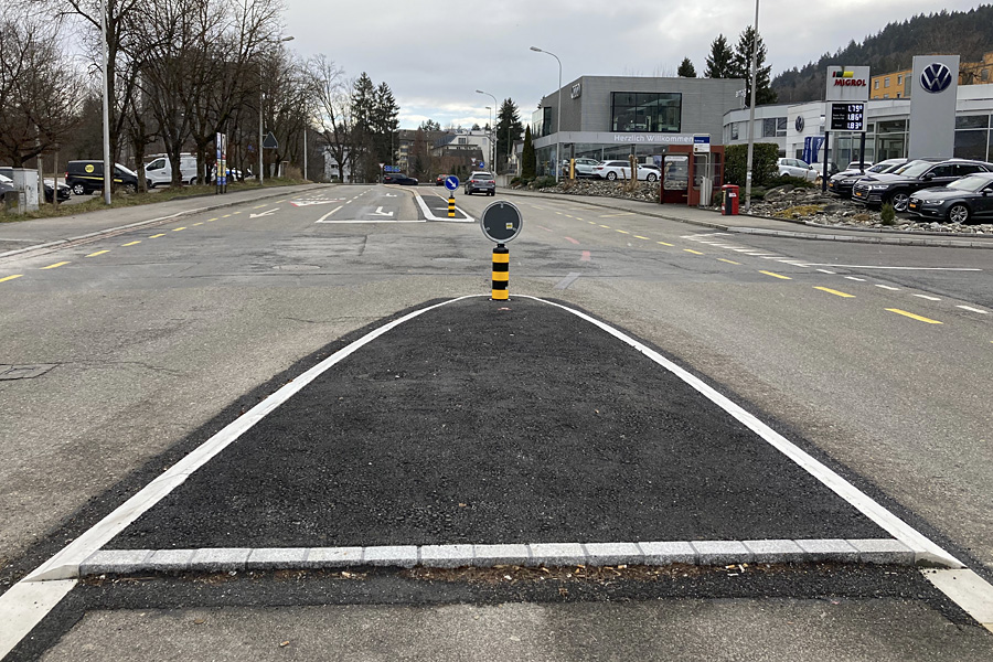 Auch zur Verkehrssicherheit tragen die Produkte von Silidur bei. Für die Verkehrsinsel bei der Einfahrt in die Anlage wurden Inselsteine vom Typ Silidur l1 zum Aufkleben auf den fertigen Belag gewählt. Die hochwertige Verarbeitung im Farbton Weiss macht die Insel zu einem sicheren Ort zwischen zwei Fahrtrichtungen.