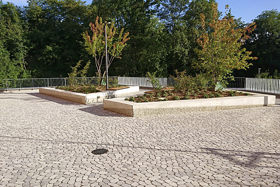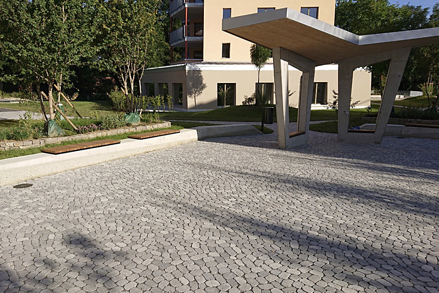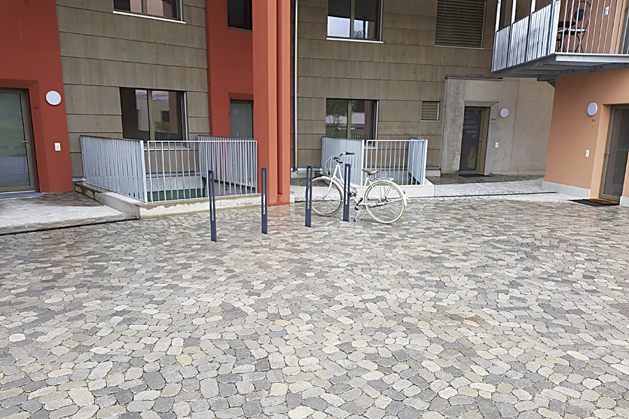 Sildur hat dafür die Arena-Pflastersteine geliefert. Als Verlegemuster wurde der sogenannte «wilde Verband» gewählt. Die relativ grosse Fläche wird so optisch aufgelockert und integriert sich mit dem eigenen Charakter perfekt ins Gesamtareal.