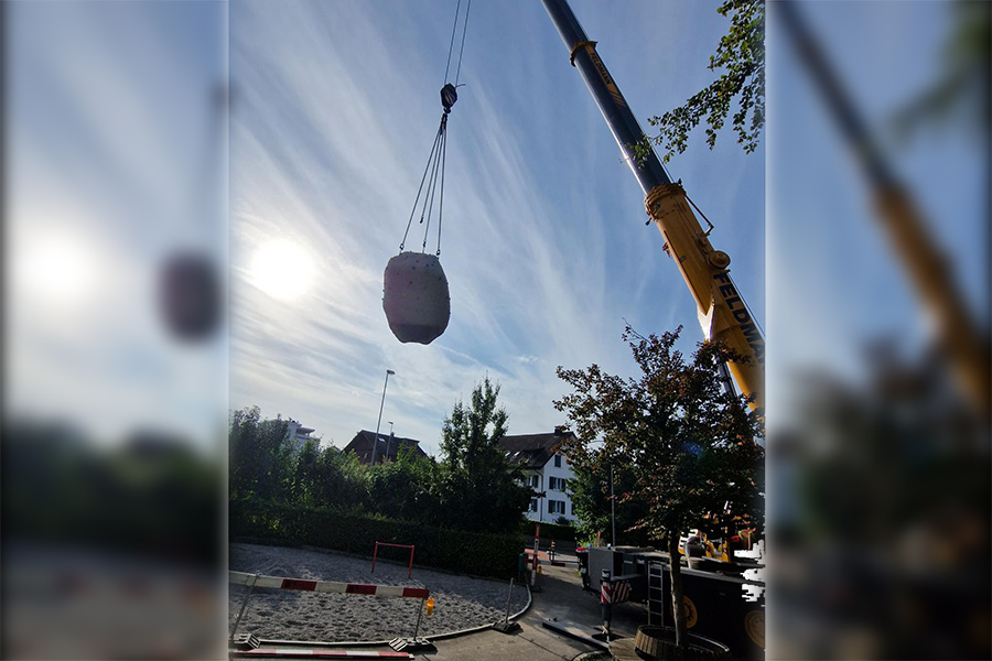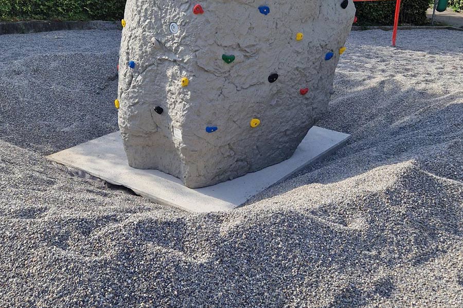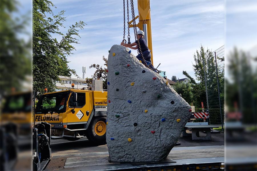 Am Tag der Lieferung wurde der Kletterfelsen mit einem Tieflader an Ort und Stelle gebracht. Trotz der engen Einfahrt zum Platz stellte die Anlieferung dank dem sehr versierten Fahrer des Pneukrans kein Problem dar. Nachdem der Pneukran eingerichtet war, wurde der Kletterstein an den Versetzschlaufen und Ketten angehoben und präzise an den gewünschten Standort gehoben. Dies erforderte eine enge Zusammenarbeit zwischen dem Pneukranführer und dem Personal, das den Stein versetzte. Nachdem der Stein sicher auf dem vorbereiteten Betonfundament stand, konnte der Pneukran wieder abgebaut werden und der Tieflader den Ort über die enge Zufahrt verlassen. Schliesslich erhielt der Kletterfels rundherum als Fallschutz noch ein ca. 40 cm tiefes Rundkiesbett, um bei Stürzen weitestgehend vor Verletzungen zu schützen.