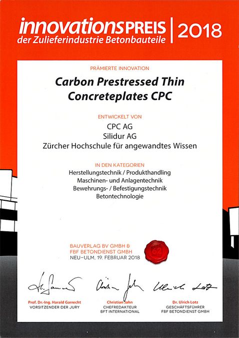 2018 wurde in den Kategorien «Herstellungstechnik/Produktehandling», «Maschinen- und Anlagetechnik», «Bewehrungs-/Befestigungstechnik» und «Betontechnologie» die CPC AG, Silidur AG und Zürcher Hochschule für angewandtes Wissen für die Carbon armierten und vorgespannten CPC Betonplatten ausgezeichnet.