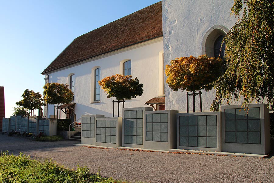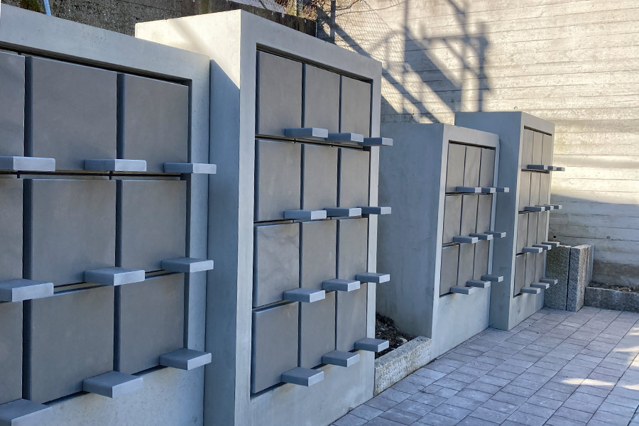 Ein aktuelles Projektbeispiel zeigt unterschiedlich hohe Einzelelemente die sich zu einer ansprechenden Urnennischenwand zusammenschliessen. Die farblich abgestimmten Betonfarben fügen sich harmonisch in die Umgebung ein.