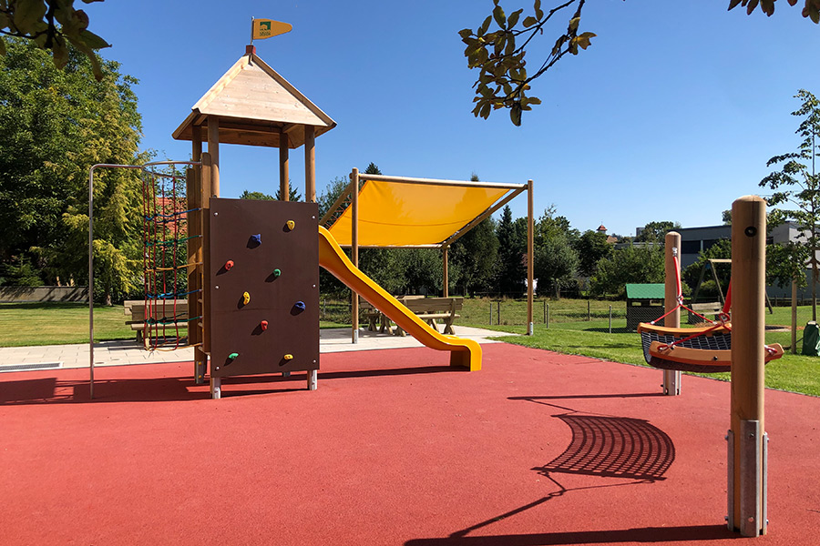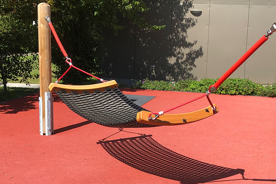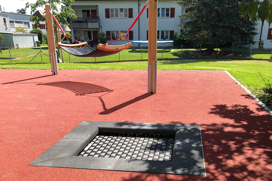 Der neu gestaltete Spielplatz erfreut sich modernster Spielgeräte, die den höchsten Sicherheitsstandards entsprechen. Ein Highlight ist sicherlich die Maxi-Hängematten-Schaukel mit einer robusten Gummigliedermatte zwischen zwei Holzstehlen. Aber auch das Spielplatztrampolin mit seinem drahtverstärkten Gurtgewebe und der Rahmenabdeckung setzt neue Massstäbe in puncto Sicherheit und Schutz vor Vandalismus.