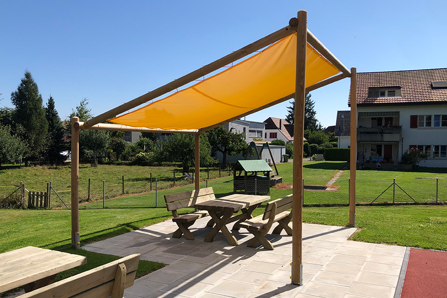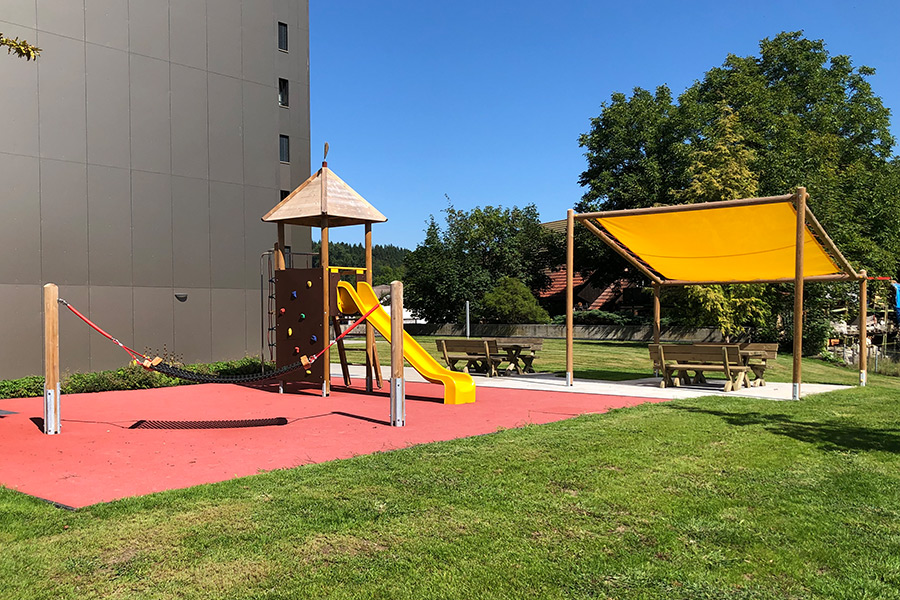 Für sonnige Tage bietet das quadratische Sonnensegel mit einer Grösse von 4 x 4 Metern optimalen Schutz. Der Kletterturm mit Rutsche wird sicherlich für leuchtende Kinderaugen sorgen und allen Kindern im Quartier viel Freude bereiten.