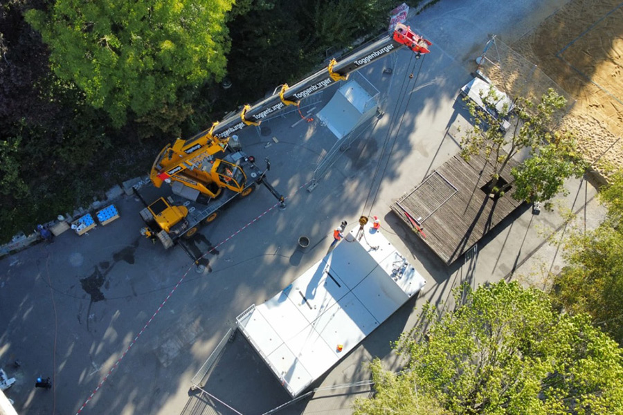 Erst mussten die bereits bestehenden Holzelemente von den Skatern abgebaut und für die Wiederverwendung zwischengelagert werden. Absperrarbeiten, Informationsschreiben an sämtliche Anspruchsgruppen, Koordination der Anlieger wie Gastronomie und Freibad bis hin zum Schutzkonzept folgten. Für die Sanität und Feuerwehr musste zwingend eine permanente Rettungsgasse freigehalten werden.