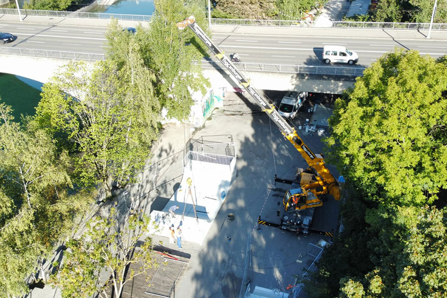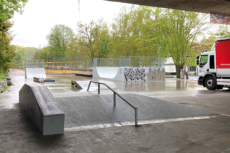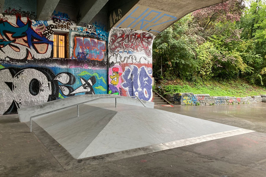 Aufgrund der Lärmemissionen dieser Skateanlage wurde explizit auf die robusten vorfabrizierten Betonfertigteile gesetzt, welche durch ihre massive Wandstärke den Lärm optimal schlucken. Die bis zu 8 Tonnen schweren Einzelteile mussten mit sehr viel Fingerspitzengefühl und einem speziell dafür ausgerichteten Pneukran versetzt werden.