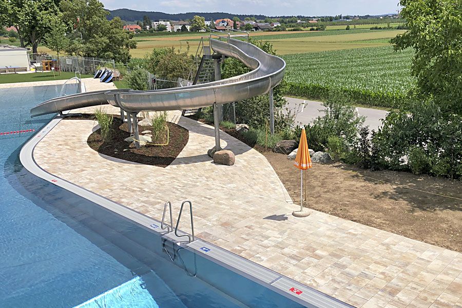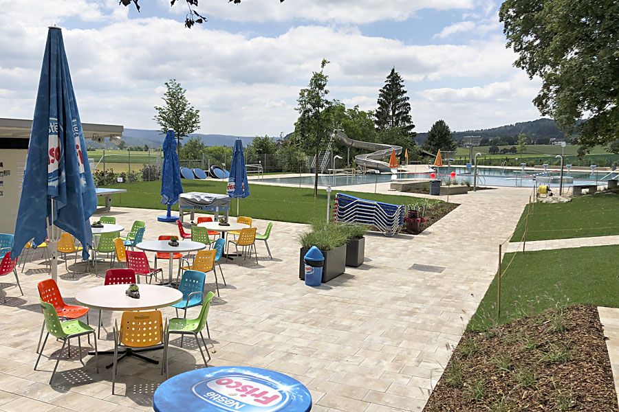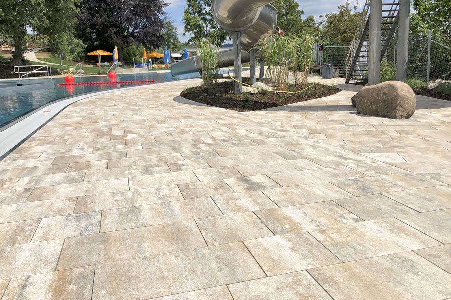 Silidur hat die Pflastersteine für die Wege und Plätze geliefert und  silisport einen Beton-Tischtennistisch mit Kunstharzplatte und gerundeten Ecken.