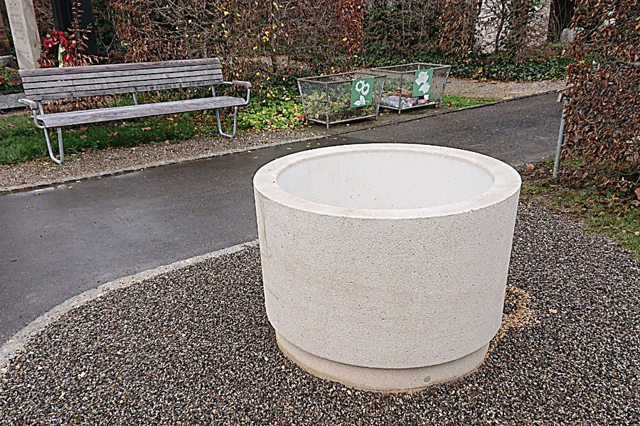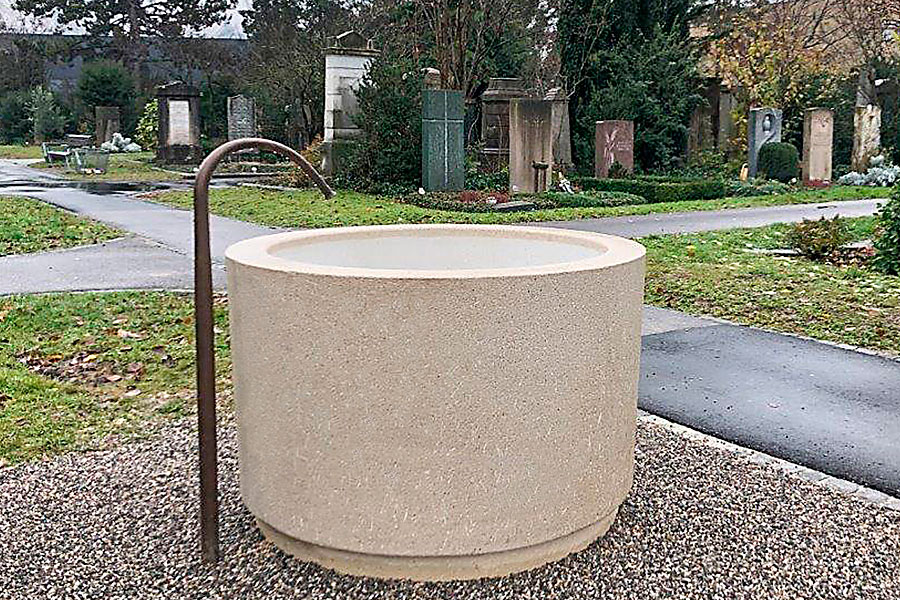 Das war auch der Wunsch der Stadtgärtnerei Basel, als sie uns den Auftrag erteilte, in enger Zusammenarbeit mit ihnen einen Schöpfbrunnen für den Friedhof Wolf Gottesacker in Basel zu entwickeln. Die Brunnen aus verschiedenen Materialien, Abmessungen und Oberflächen auf dem Friedhofsareal sollten durch eine einheitliche Ausführung ersetzt werden.