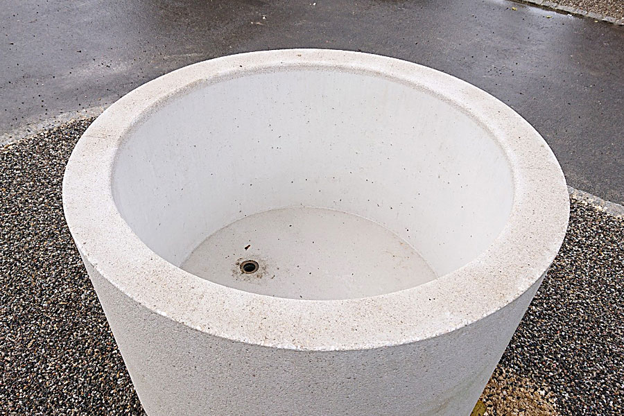 Aus dieser engen Zusammenarbeit ist ein leicht konisch kreisrunder Schöpfbrunnen in den Aussenabmessungen 104 bis 109 cm und einer Bauhöhe von 80 cm entstanden. Er wurde aus hochwertigem Jurakies-Beton mit Weisszement hergestellt. Die fein gestrahlten äusseren Oberflächen verleihen dem Brunnen eine edle, aber nicht aufdringliche Optik. Ein freistehender Brunneneinlauf mit spezieller Rundung und Verjüngung rundet das Gesamtbild ab.