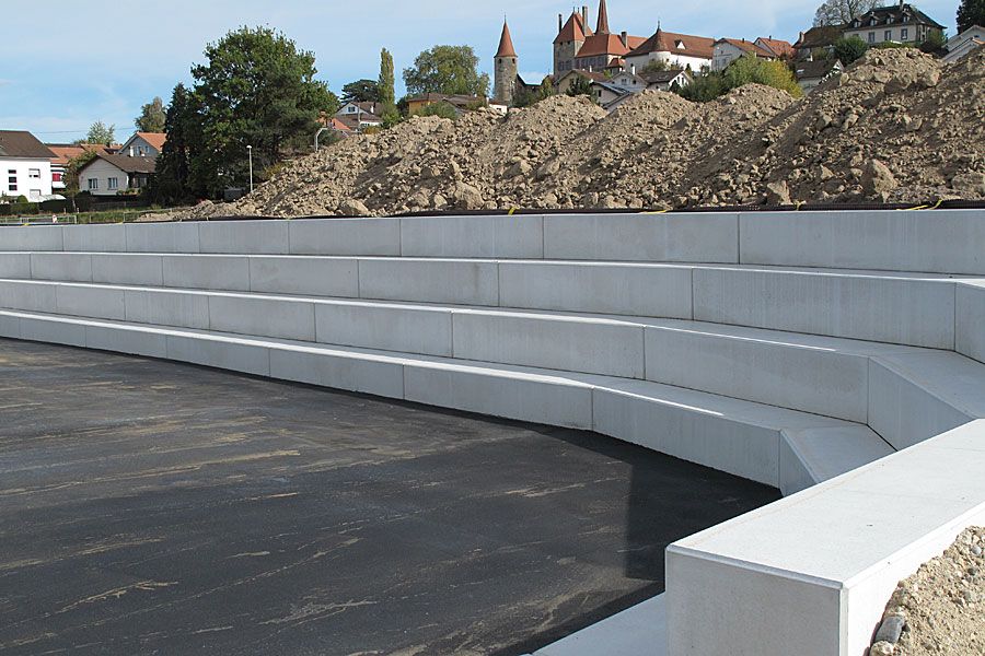 Im Centre sportif in Avenches entstand mit Tribünenelementen ein Amphitheater für «Inlinehockeyaner», für Training- und Wettkampfturniere und in Servion hat die silisport ag bei der Ecole de Servion Spezial-Elemente geliefert mit integrierter Treppenstufen.